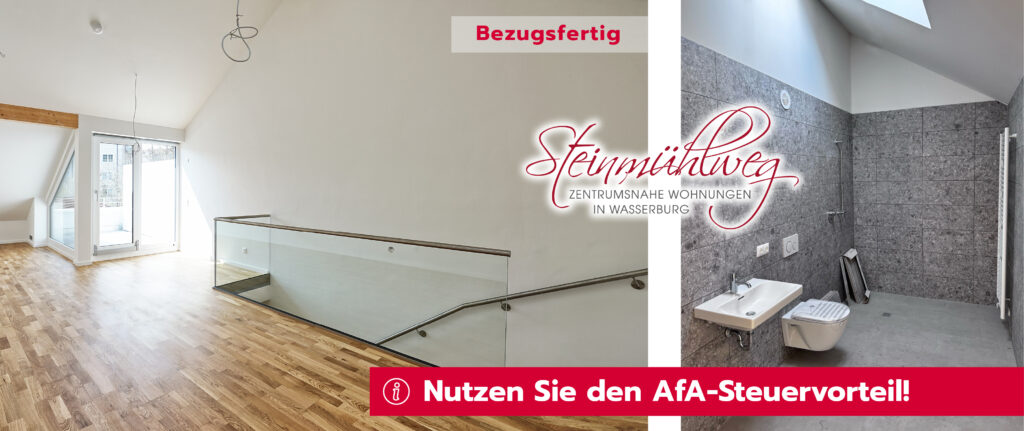 Das Stadtzentrum von Wasserburg am Inn ist nur wenige Minuten entfernt und bietet ein vielfältiges kulturelles Angebot, zahlreiche Einkaufsmöglichkeiten, Restaurants und Cafés sowie attraktive berufliche Perspektiven. Die perfekte Kombination aus urbanem Leben und naturnaher Erholung macht den „Steinmühlweg“ zu einer einzigartigen Wohngegend.
