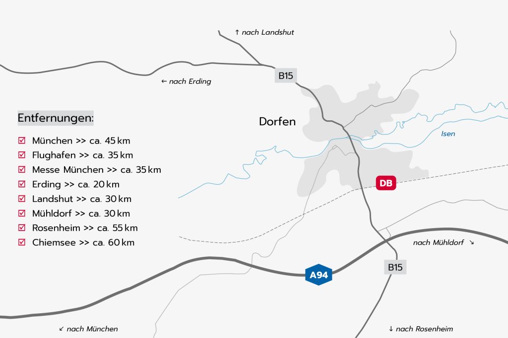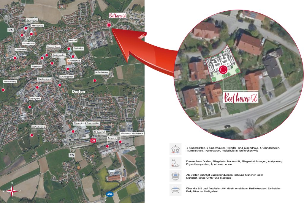 Das „Beethoven56“ liegt in einer Wohnsiedlung im nördlichen Teil von Dorfen. Die Umgebung ist geprägt von Ein- und Mehrfamilienhäusern sowie gepflegten Wohnanlagen, die eine ruhige und freundliche Atmosphäre bieten. Supermärkte, Restaurants, Schulen, Ärzte und Freizeiteinrichtungen sind schnell erreichbar und sorgen für eine gute Infrastruktur. Dank der ausgezeichneten Verkehrsanbindung ist das „Beethoven56“ ein praktischer Ausgangspunkt für den Arbeitsweg oder Unternehmungen in der Stadt. Für Erholung im Grünen bietet der nahegelegene Vilstalradweg eine ideale Möglichkeit für Spaziergänge und Radtouren.
