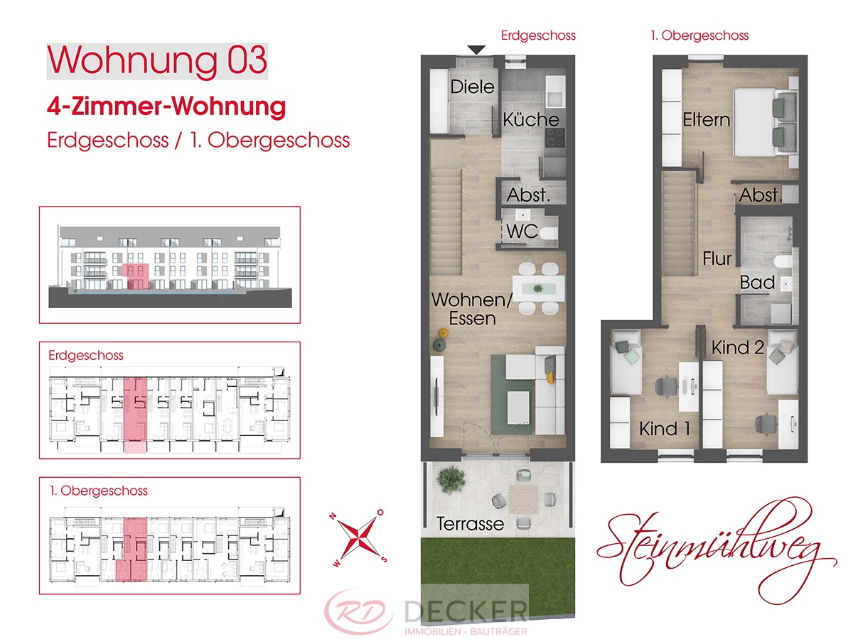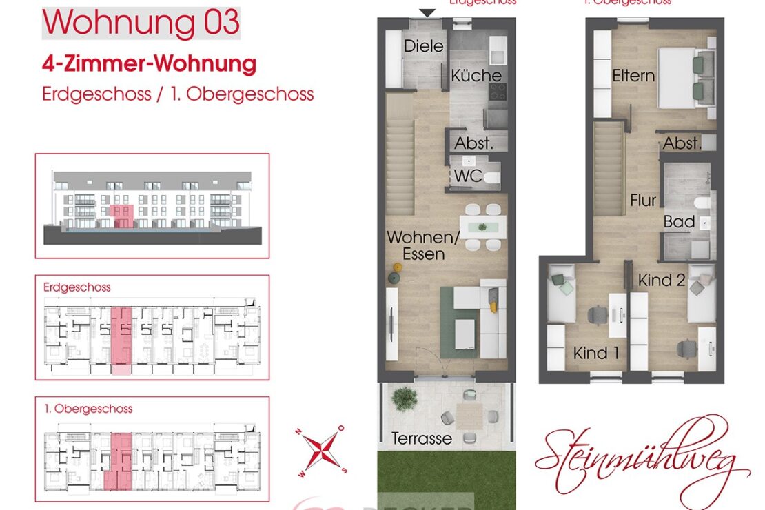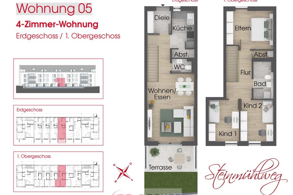 Diese großzügige 4-Zimmer-Wohnung erstreckt sich über zwei Etagen (Erdgeschoss und 1. Obergeschoss) der Wohnanlage „Steinmühlweg“ in Wasserburg am Inn und bietet eine durchdachte Raumaufteilung sowie hochwertige Ausstattung, die ideal für Familien ist.