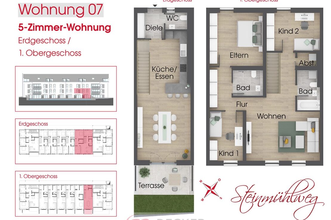 Diese großzügige 5-Zimmer-Wohnung erstreckt sich über zwei Etagen (Erdgeschoss und 1. Obergeschoss) der Wohnanlage „Steinmühlweg“ in Wasserburg am Inn und bietet eine durchdachte Raumaufteilung sowie hochwertige Ausstattung, die ideal für Familien ist.