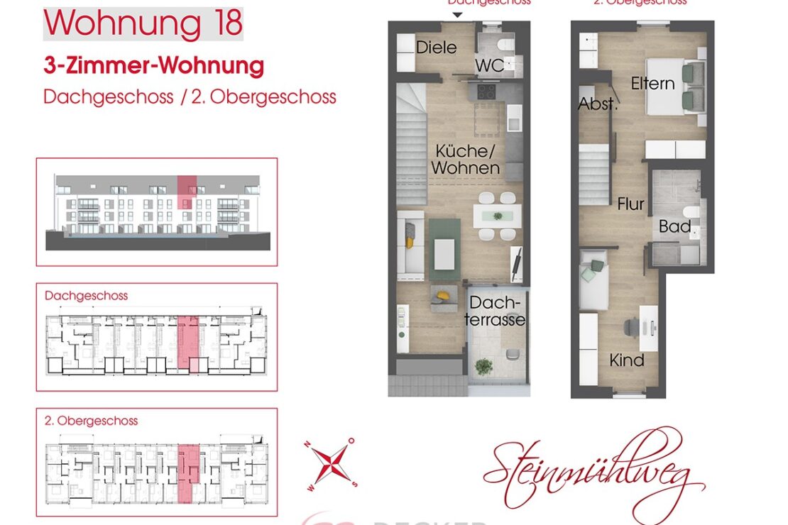 Diese moderne 3-Zimmer-Wohnung erstreckt sich über zwei Etagen (2. Obergeschoss und Dachgeschoss) der Wohnanlage „Steinmühlweg“ in Wasserburg am Inn und bietet eine durchdachte Raumaufteilung sowie hochwertige Ausstattung, die ideal für Paare oder Einzelpersonen ist, die zusätzlichen Raum für ein Büro oder Gästezimmer benötigen.