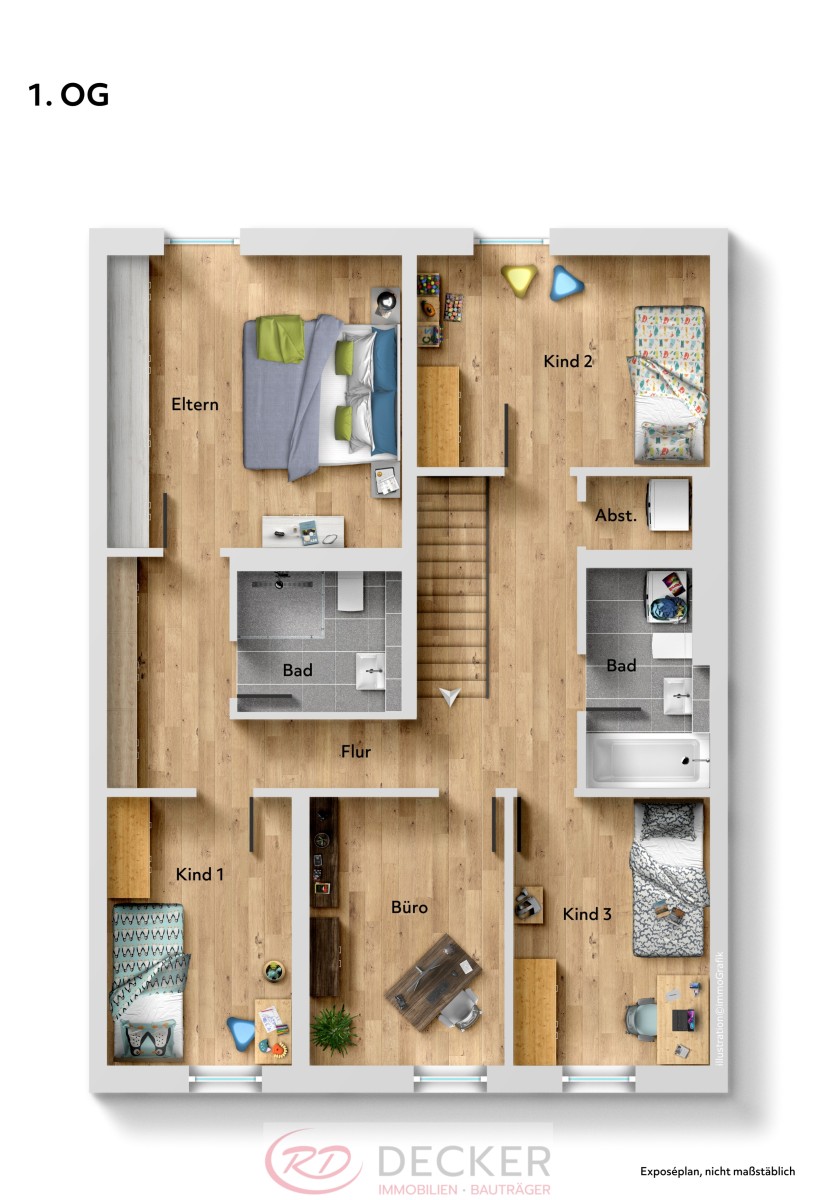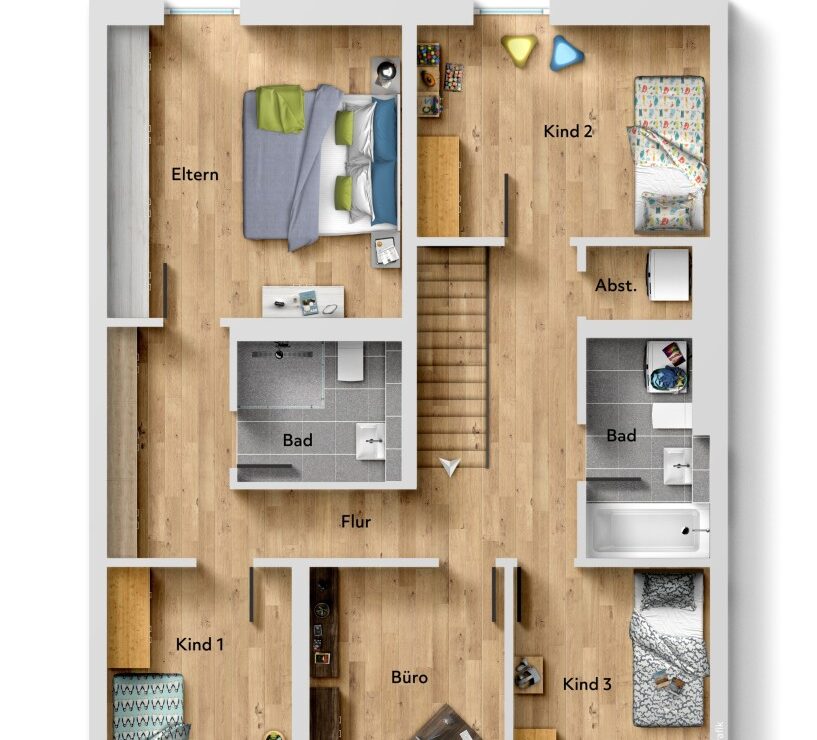Im Erdgeschoss erwartet Sie ein moderner, offener Wohn-, Ess- und Kochbereich mit direktem Zugang zur sonnigen Terrasse. Im 1. Obergeschoss wurde das ursprüngliche Wohnzimmer geteilt, sodass hier zwei zusätzliche Zimmer entstehen – ideal als Kinderzimmer, Gästezimmer oder Homeoffice.
