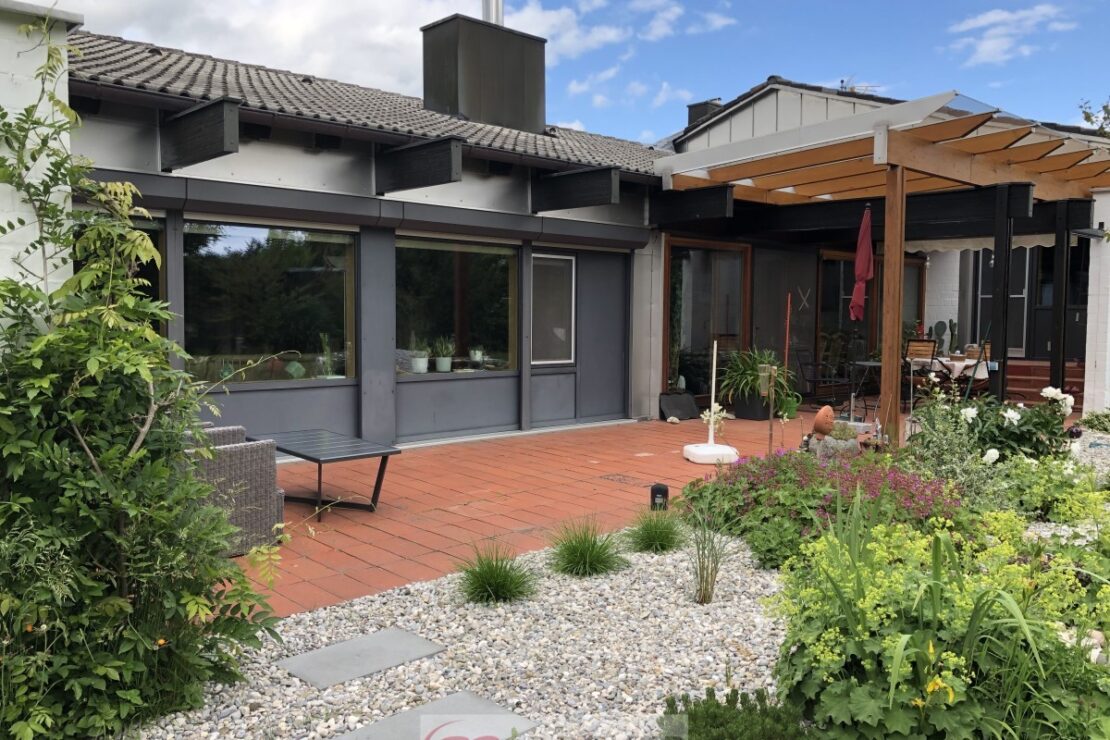 Der liebevoll angelegte, weitläufige Garten bietet unterschiedliche Raumerlebnisse. An heißen Sommertagen sorgt der hauseigene Pool mit Wärmepumpe für erfrischende Abkühlung – ein Highlight für Groß und Klein.