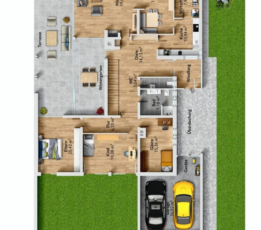Beim Betreten des Hauses empfängt Sie zunächst ein kleiner Windfang, der Sie in den weitläufigen Eingangsbereich führt. Über diesen großzügigen Flur gelangt man in eine helle, separat abschließbare Küche, die nicht nur funktional ist, sondern auch Zugang zum angrenzenden Wirtschaftsraum für Waschmaschine und Wäschetrockner bietet – perfekt für die Lagerung von Vorräten, Haushaltsutensilien, etc.