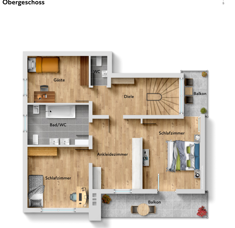 Das Obergeschoss umfasst drei gut geschnittene Schlafzimmer sowie ein großzügiges Tageslichtbad. Vom Masterbedroom aus haben Sie Zugang zu zwei Balkonen – einer nach Osten, einer nach Süden ausgerichtet – ideal zum Start in den Tag oder für entspannte Abendstunden.