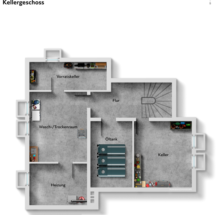 Das Haus ist voll unterkellert und bietet zusätzliche Nutzfläche für einen Aufenthaltsraum, Hauswirtschaft oder als Lagerfläche. Abgerundet wird das Angebot durch eine angrenzende Doppelgarage, die sowohl Komfort als auch praktischen Stauraum gewährleistet. Besonders nennenswert ist die überdurchschnittliche Höhe der Garage mit 2,67 m. Hinter der Garage befindet sich zudem ein Hobbyraum, der bislang als Werkstatt genutzt wurde.