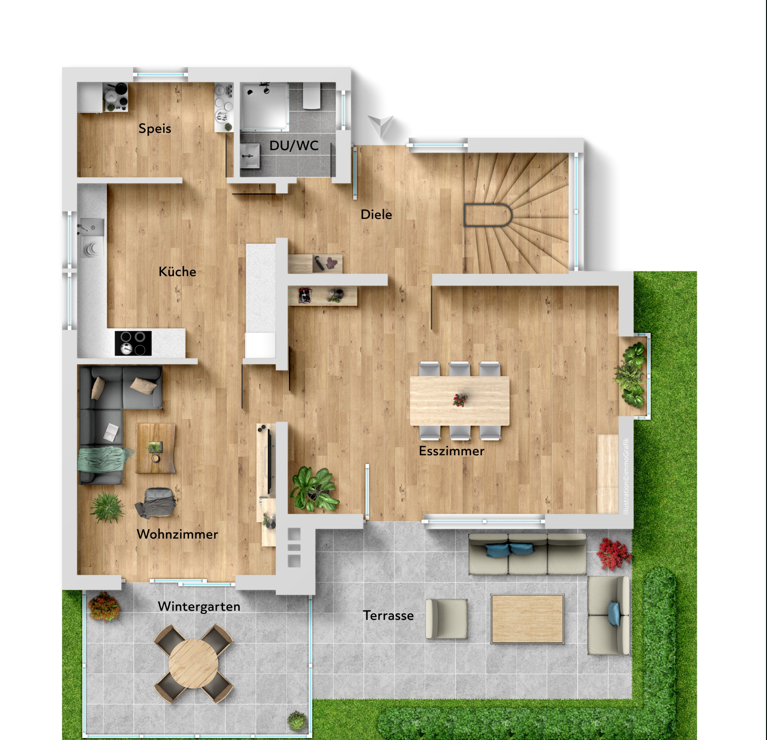 Im Erdgeschoss empfängt Sie ein einladender Eingangsbereich mit angrenzendem Duschbad. Das benachbarte Esszimmer öffnet sich harmonisch zum großzügigen Wohnzimmer, das viel Platz für geselliges Miteinander bietet. Die funktional ausgestattete Einbauküche wird durch eine praktische Speisekammer ergänzt. Direkt an das Wohnzimmer angeschlossen befindet sich der beheizte Wintergarten – ein behaglicher Rückzugsort zu jeder Jahreszeit.