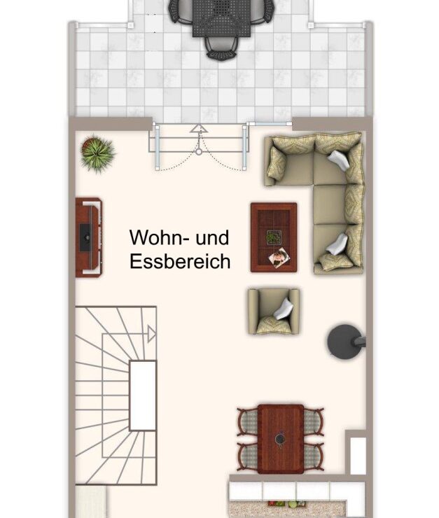 Über eine elegante Holztreppe gelangen Sie in das offen gestaltete Dachgeschoss. Hier bilden Wohnen, Kochen und Essen eine harmonische Einheit.