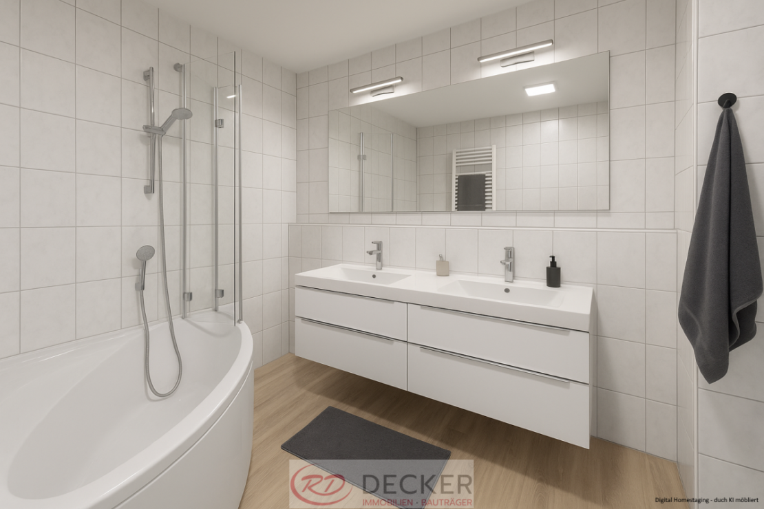 Das stilvolle Badezimmer ist mit einer modernen Dusche und einer komfortablen Eckbadewanne ausgestattet – der ideale Rückzugsort für entspannte Momente.