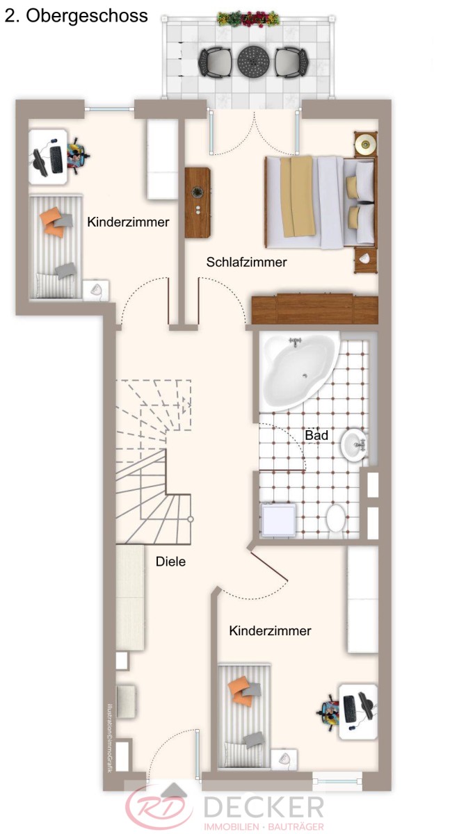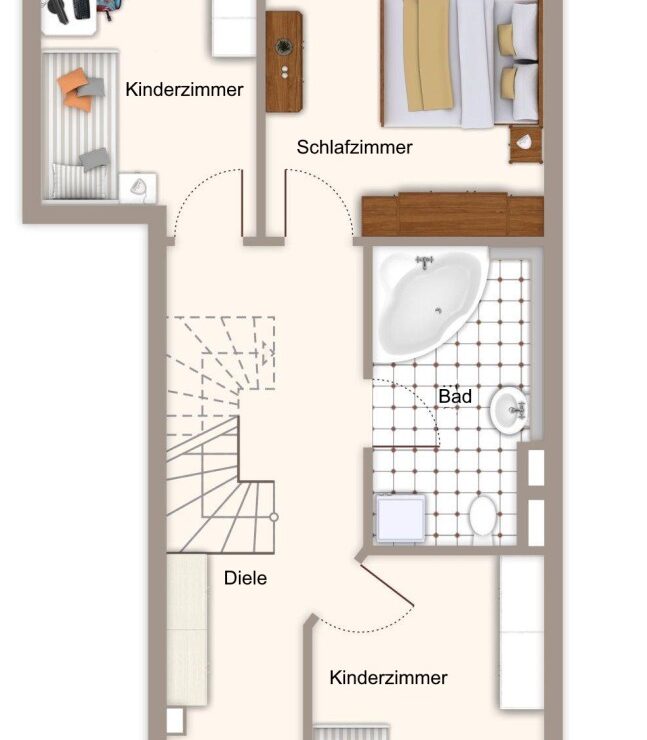 Im unteren Bereich empfängt Sie ein großzügiger Eingangsbereich mit einladender Atmosphäre. Das Hauptschlafzimmer verfügt über einen eigenen Balkon und ist mit einem maßgefertigten Einbauschrank mit hochwertigen Glasschiebetüren ausgestattet. Zwei weitere Zimmer bieten flexible Nutzungsmöglichkeiten – ob als Kinder-, Gäste- oder Arbeitszimmer.