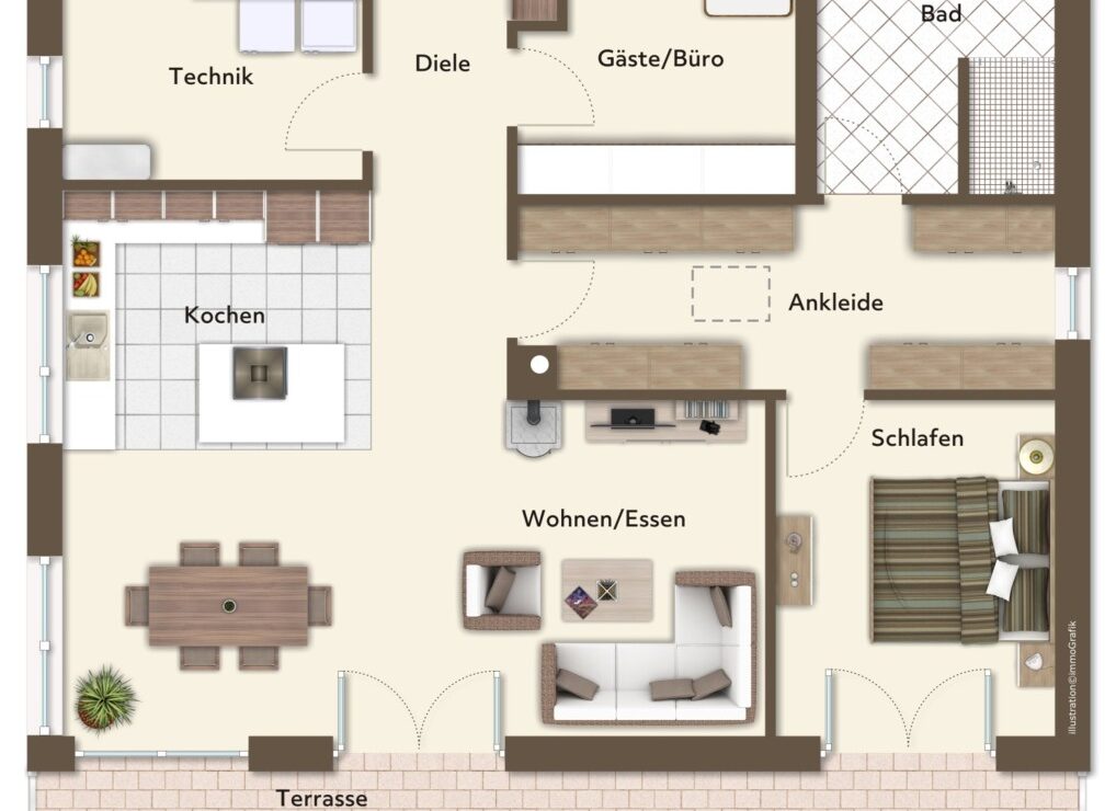 Auf rund 120 m² Wohnfläche, die sich komplett über das Erdgeschoss erstreckt, erwartet Sie ein offenes, lichtdurchflutetes Wohnkonzept. Der großzügige Wohn-, Koch- und Essbereich bildet das Herzstück des Hauses und öffnet sich über bodentiefe Fenster zur überdachten Terrasse mit Blick ins Grüne.