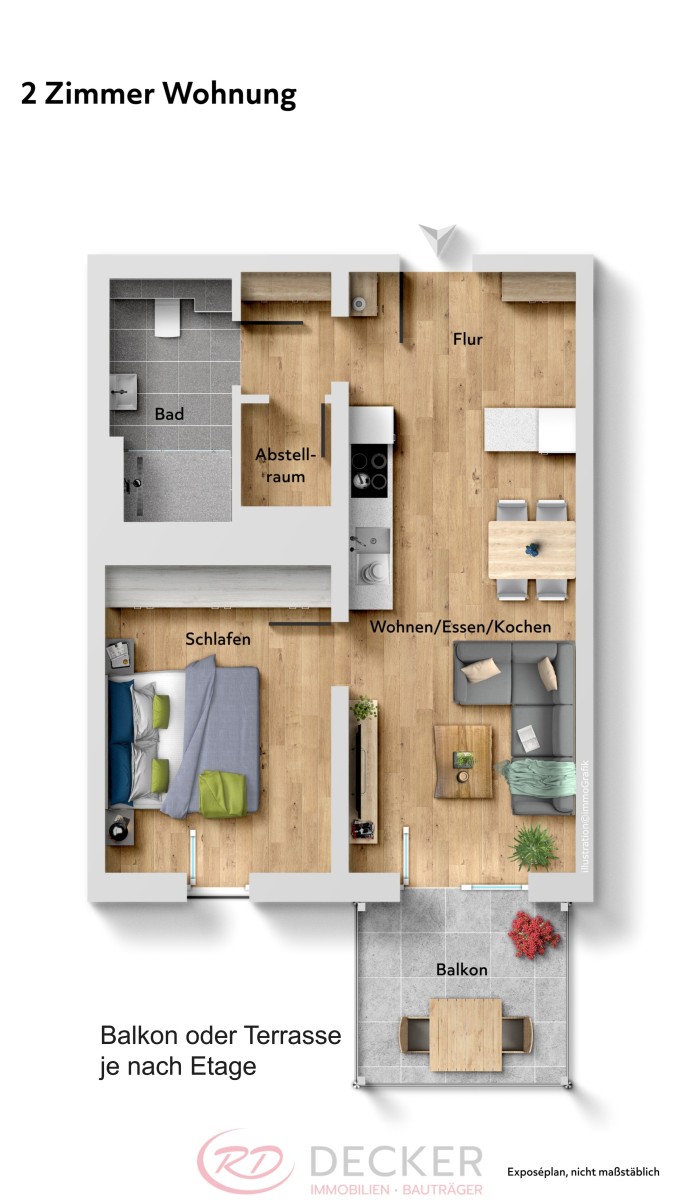 Offener Wohn-/Essbereich mit Zugang zur Terrasse, Schlafzimmer, modernes Bad mit bodengleicher Dusche sowie praktischer Abstellraum. Ideal für Singles oder Berufspendler.